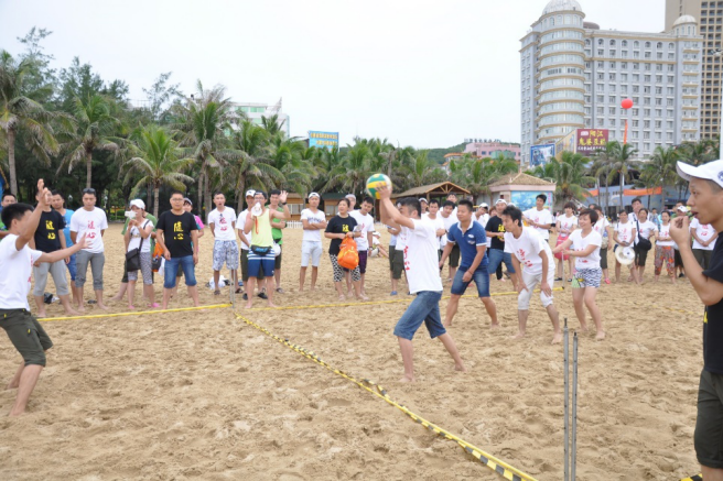我們在黃金海岸舉行了沙灘排球、拔河、兩人雙足等眾多有利于團建的沙灘娛樂活動。看看我們的沙灘排球誰更厲害,首先姿勢要擺對,聽我口哨準備發球啦!啦啦隊們為我們的精彩比賽喝彩!