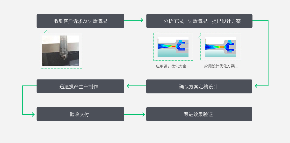 收到客戶訴求及失效情況 → 分析工況,失效情況、提出設計方案 → 應用設計優化方案 →  確認方案定稿設計 → 迅速投產生產制作 → 驗收交付 → 跟進效果驗證