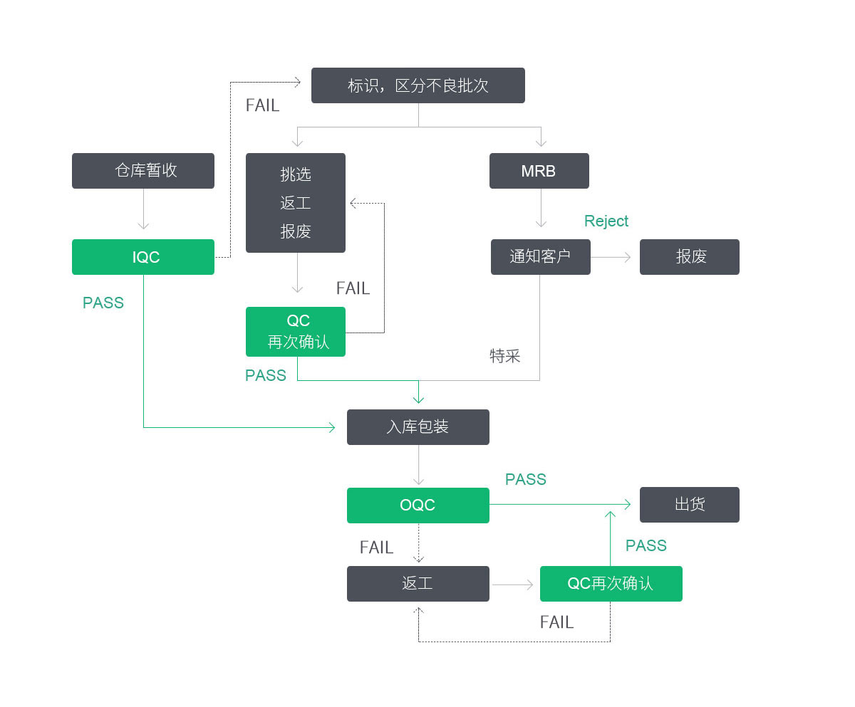 建立健全的質(zhì)量管理制度,針對(duì)生產(chǎn)加工控制過程建立來料檢驗(yàn)(IQC),過程檢驗(yàn)(IPQC),終檢(FQC),出貨檢驗(yàn)(OQC)四個(gè)階段檢驗(yàn),全方位控制產(chǎn)品質(zhì)量。嚴(yán)格控制原材料質(zhì)量,嚴(yán)格執(zhí)行各工序的工藝參數(shù),嚴(yán)格執(zhí)行檢驗(yàn)過程,依據(jù)檢驗(yàn)規(guī)范及客戶要求等進(jìn)行有序管控,確保產(chǎn)品出貨質(zhì)量滿足客戶需求。